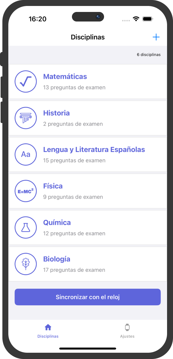 Agrega las disciplinas necesarias y luego escribe las respuestas por tema y pregunta; la aplicación organizará toda la información por sí misma.