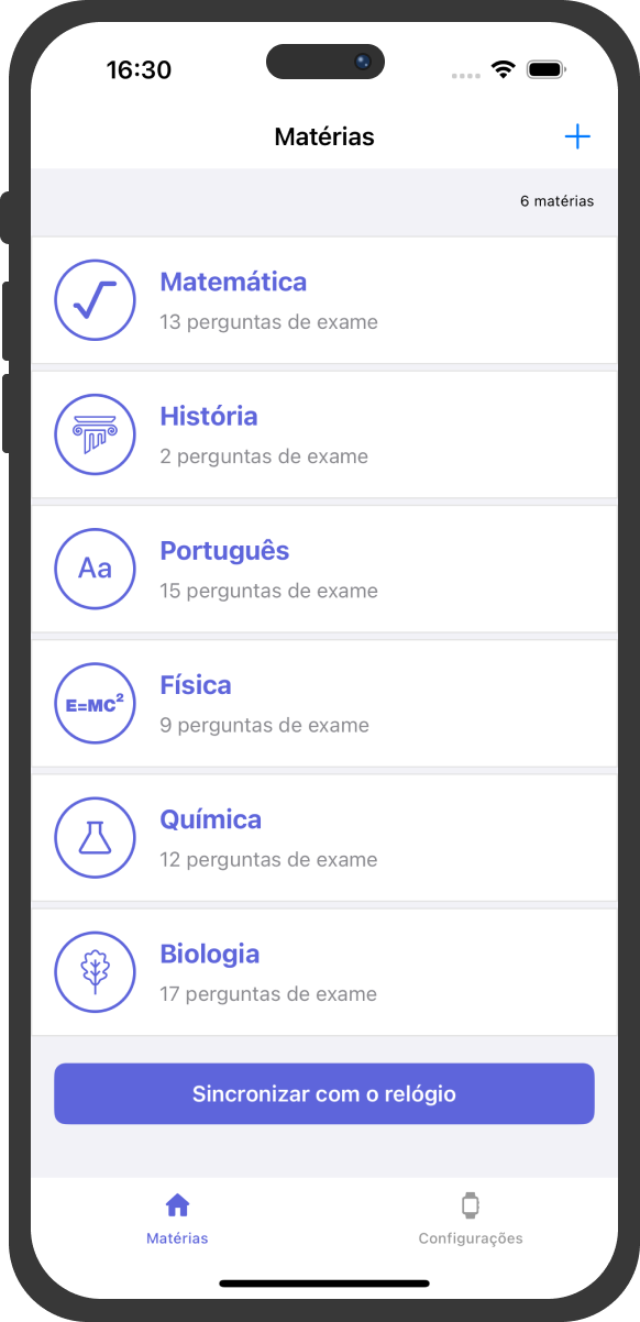 Adicione as matérias desejadas e escreva as respostas por tópico — o aplicativo organizará todas as informações.
