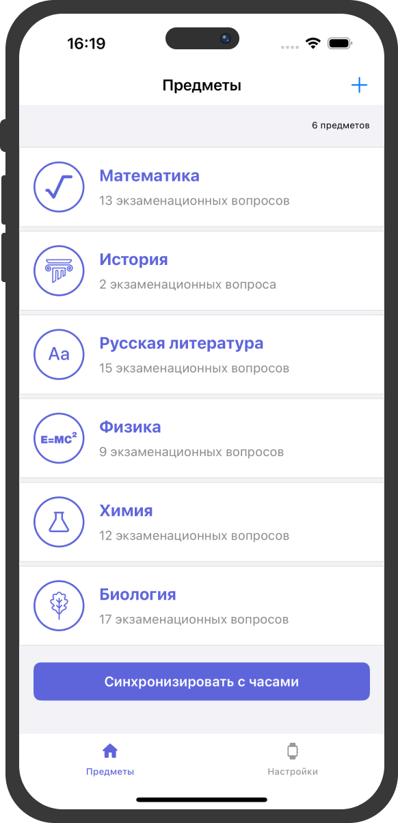 Добавь нужные предметы, а затем напиши ответы по темам и билетам – приложение само упорядочит всю информацию.